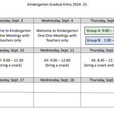 Breadcrumb Home News Stories news Kindergarten Gradual Entry Schedule May 23, 2024 Here is the gradual entry schedule for Kindergarten, September 2024. To find out when your interview is, and which group your child needs to attend, please reference the email sent to you, or contact the school office. We look forward to seeing you!